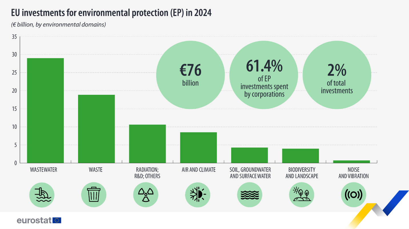 Secondo Eurostat, nel 2024 i Paesi Ue hanno destinato 76 miliardi di euro per servizi ambientali. Ben il 61,4% di questi investimenti è stato sostenuto da imprese private